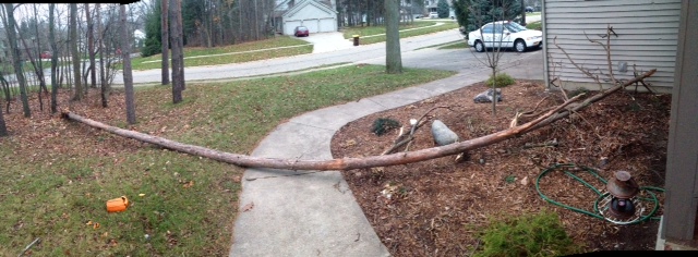 First thought: God is kind. That tree did not hit the window, the roof, or even the little center piece tree in our garden. Only the Lord could providentially thread such a small space with such a huge object in a seemingly chaotic storm.