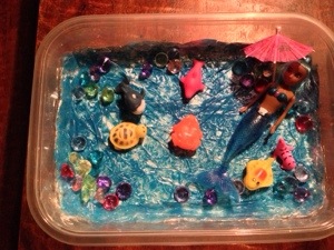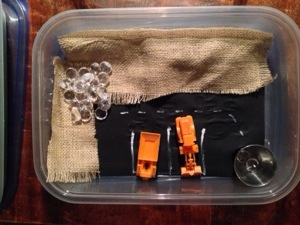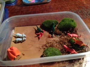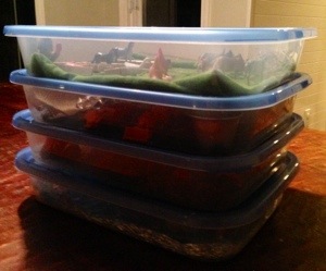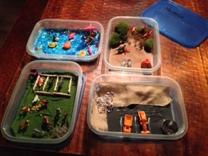 No matter. In as much as it is up to me and the dollar store we’re going to succeed this year. I’ve come up with these little self-contained imaginary lands to pull out, along with pipe cleaners, new dolls, bingo, and wall decals to play with on the car windows. Any other ideas?